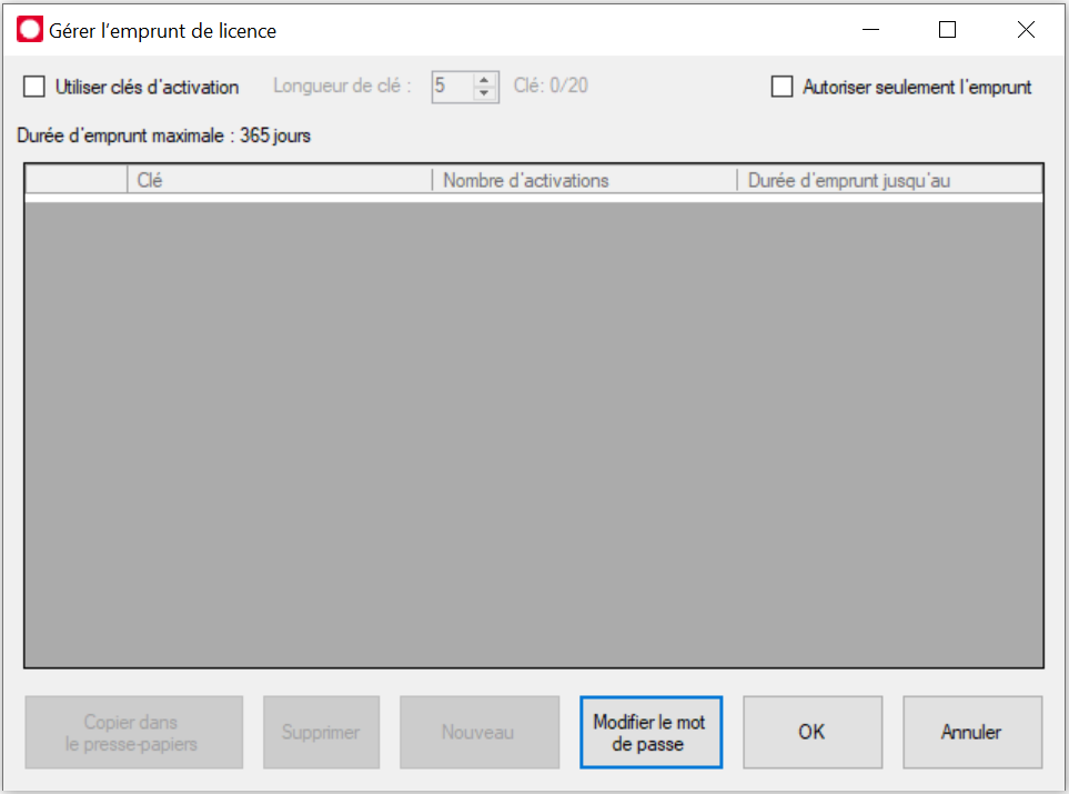 Quand l’option n’est pas activée, une licence peut également être empruntée sans clé d’activation.