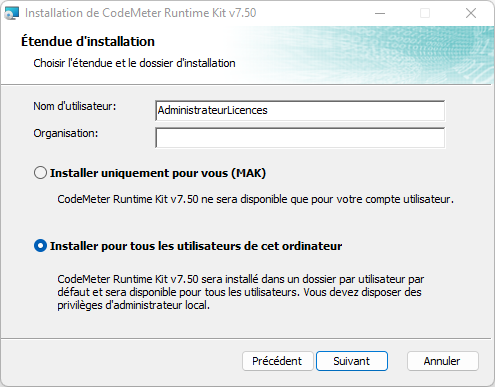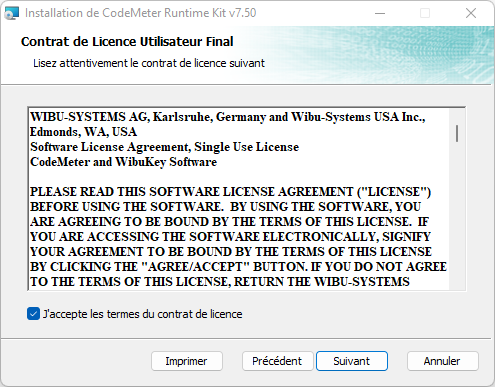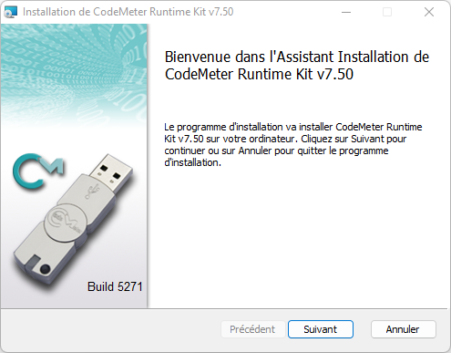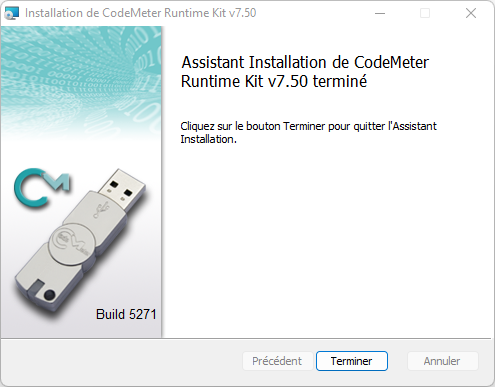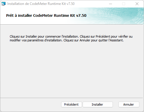 Après l’installation du gestionnaire de licences, la fenêtre Installation de CodeMeter Runtime Kit <numéro de version> s’ouvre.