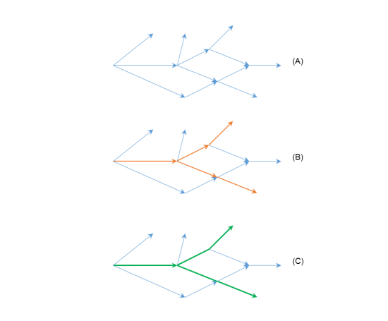 In the next image, graph A shows a street graph. Graph B (red) shows a selection of graph A, creating links with a one-to-one relation to the streets. Graph C (green) is the simplified version of the link graph B, therefore it has a one-to-many relation to the street graph A.