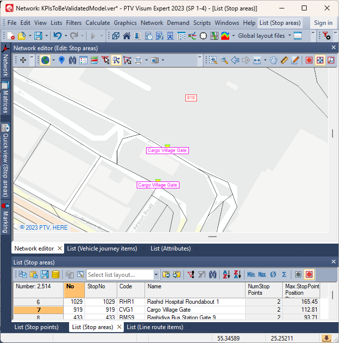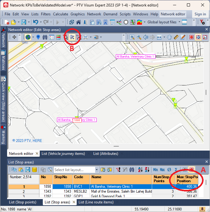The inspection can be performed opening the Visum model containing the KPIs (see the ToBeValidatedModelDirectory configuration parameter), and looking to the Stop Areas with the stop points exceeding the distance.