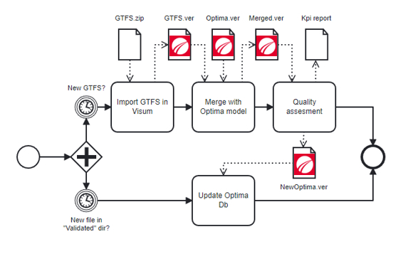 The input of the process is composed by the Optima Visum model (.ver file) and a .zip file containing the GTFS data.