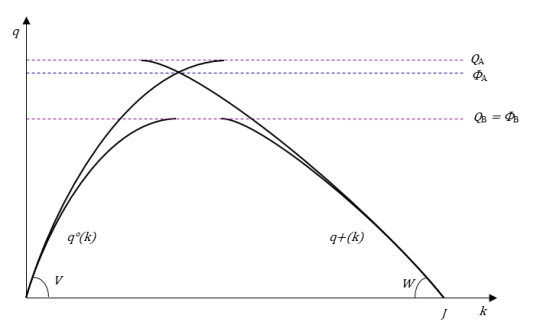QA is a flow state actually unachievable. Despite the shapes of the two branches, it yields to a maximum flow of ΦA, smaller than QA.