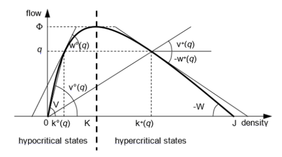 Referring separately to the two branches (hypocritical and hypercritical) of the fundamental diagram, we can then introduce the following functions of the flow: