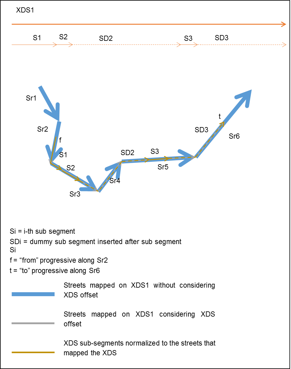 After applying a filter on the received data to consider only the matched XDS, for each matched XDS the speed information is assigned to the streets included in the XDS. The speed information is given according to the subsegments.