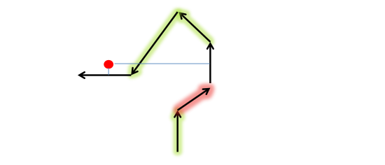 The next images show an example of the non-recursive path expansion vs. two examples of the recursive method. For the recursive examples, the stopping criteria must allow to approach the new GPS point and they must stop the process when we are moving too far away from the new GPS point. Also the algorithm must avoid infinite looping over the same streets.