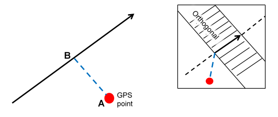 Given a GPS point that is associated with a street, the orthogonal projection segment AB (dashed blue line) is the score .
