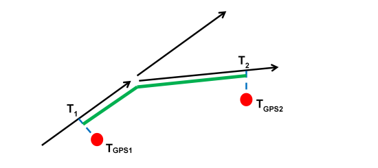 Given two consecutive GPS points, the score is computed as the difference between the elapsed time of the two GPS timestamps, and the time needed to cover the matched path (green line) between the feet of the projected GPS points.