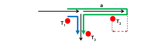 Given the three points T1, T2, and T3, the blue path has to be compared to the green one in order to select the best map match. The green path contains the U-turn penalty that is proportional to the travel time needed to go from the To node of the arc a to the point T2 (dashed red double arrow).