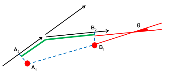Given two consecutive GPS points, the score is proportional to the angle θ between the line connecting the two GPS points and the line identified by the last piece of the map-matched trajectory.