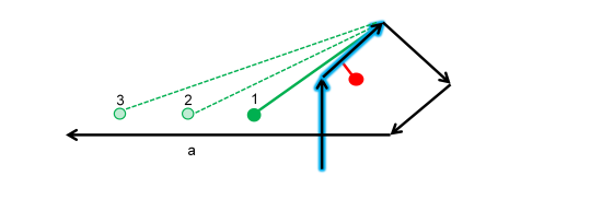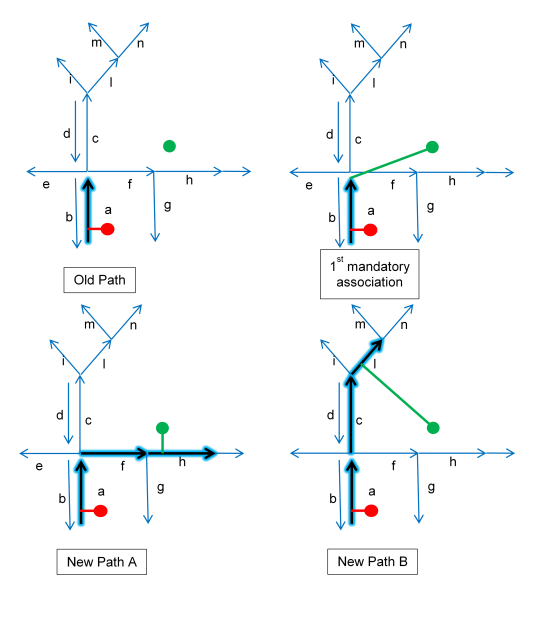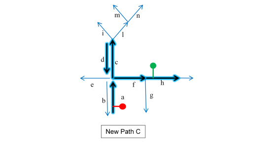 Based on the recursive expansion, the new GPS point (green dot in the next image below) produces three new paths A, B, and C, highlighted with a blue halo. After the first mandatory association, the forward star of the link a is composed by the links b, c, e, and f. However, only the links c and f can be expanded. So, taking f, only the link h can be expanded again. Then the recursion stops, producing the path A (a→f→h). While taking c, its forward star can be expanded into l and d. So, following l the recursion stops immediately, creating the new path B (a→c→l). Following d, its forward star can be expanded only into f, and the recursion produces the new path C (a→c→d→f→h).
