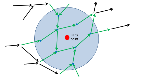 Given a GPS point (red dot) from which a new trajectory has to be created, a circle around this GPS point (blue area) is considered. For all nodes of the graph inside this area (blue dots), every incoming and outgoing street arc (green arrows) is considered for creating the first set of trajectories.