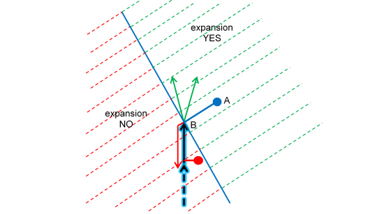 Given a path (blue halo) and a new GPS point (blue dot), expansion is allowed only for those links (green arrows) of the forward star of the last arc of the path that are pointing towards the green half-plane region . This region is defined by the orthogonal line to the segment that joins the new GPS point (A) with the To node of the last arc (B). These criteria allow an expansion in the direction of the new GPS point until it is not overcome.