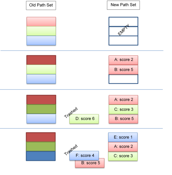The next image illustrates the strategy for creating the new set of paths from the previous set. Each colored box represents a path. Dark colors indicate that the path is expanded and the newly generated paths are inserted into the new set.