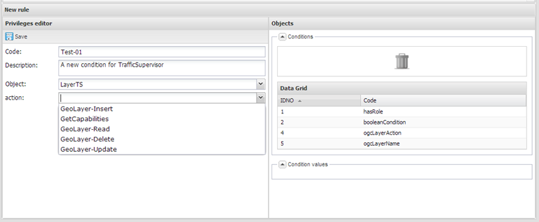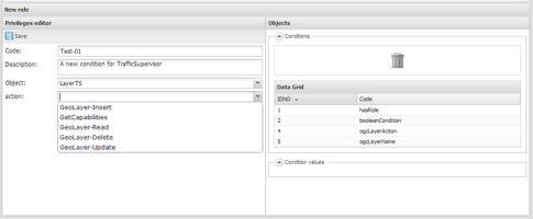Field Description Code Unique textual code identifier for the group (mandatory). Description Description of the group (optional). Object Indicates on which object the set of permissions is to be evaluated (mandatory). Depending on the selected object, the fields Action and Conditions are populated automatically. An action identifies the type of activity that can be protected with authentication.