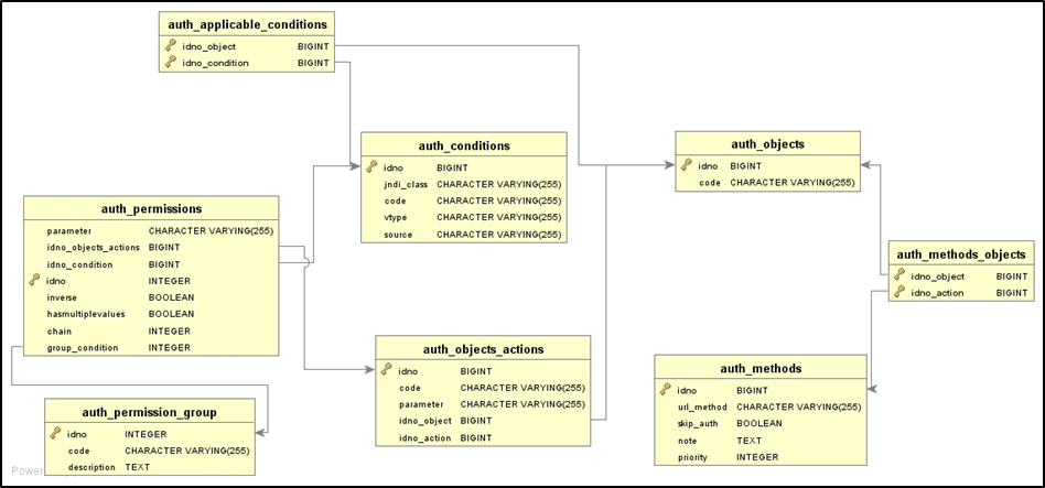 Permissions | AUTH_PERMISSIONS | A permission is a condition that is associated to a value to be tested. Permissions are in a logical AND relationship to each other. If permissions are of the same type, they are in a logical OR relationship to each other. |