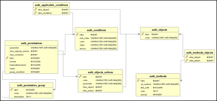 Actions | AUTH_OBJECTS_ACTION | An action is a special condition associated with an object. Each authentication rule refers to an action. The actions are used to identify the type of request sent to the module (example: read and write access). |