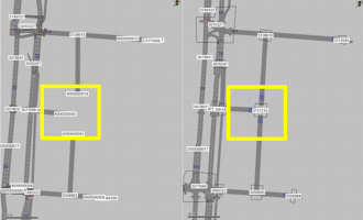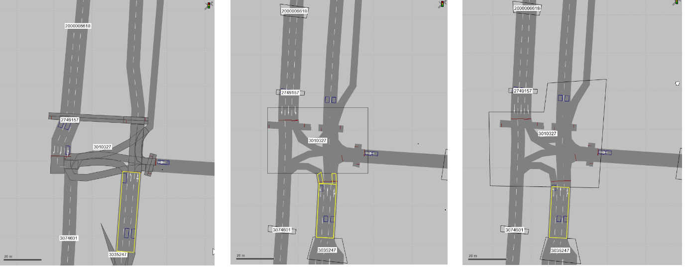 - Middle: the geometry of the PTV Vissim links is changed and the node 3010327 is changed to a polygon node. As a result, the yellow highlighted edge does not have a unique sequence of PTV Vissim links and connector links.