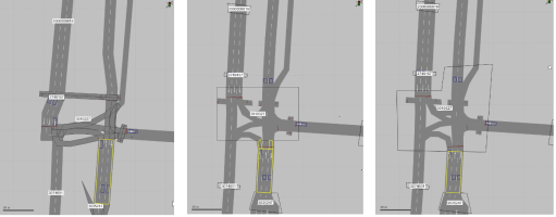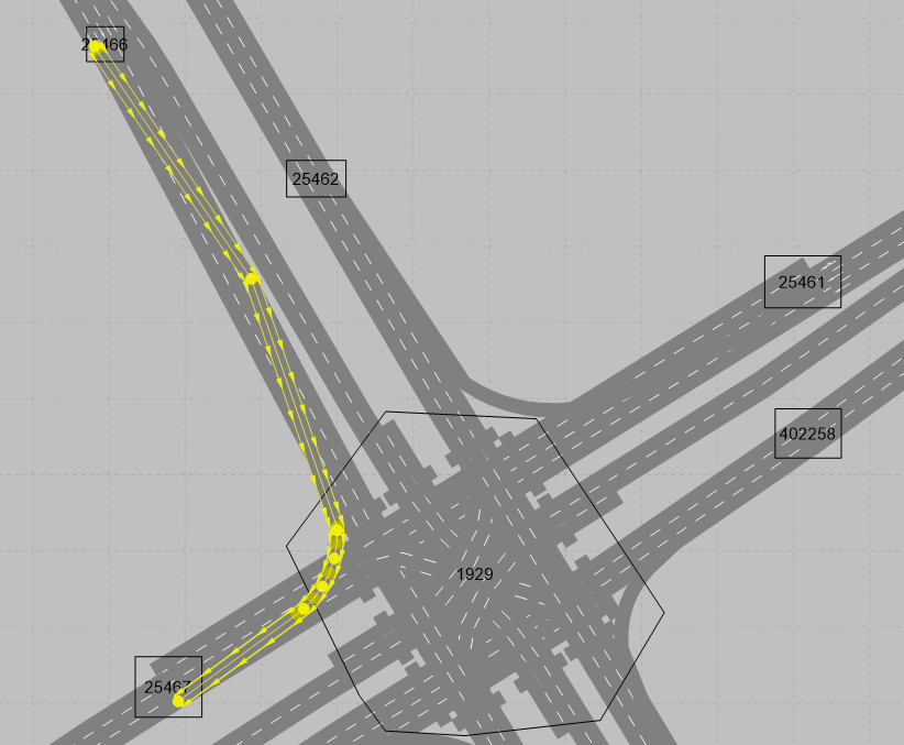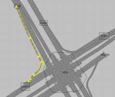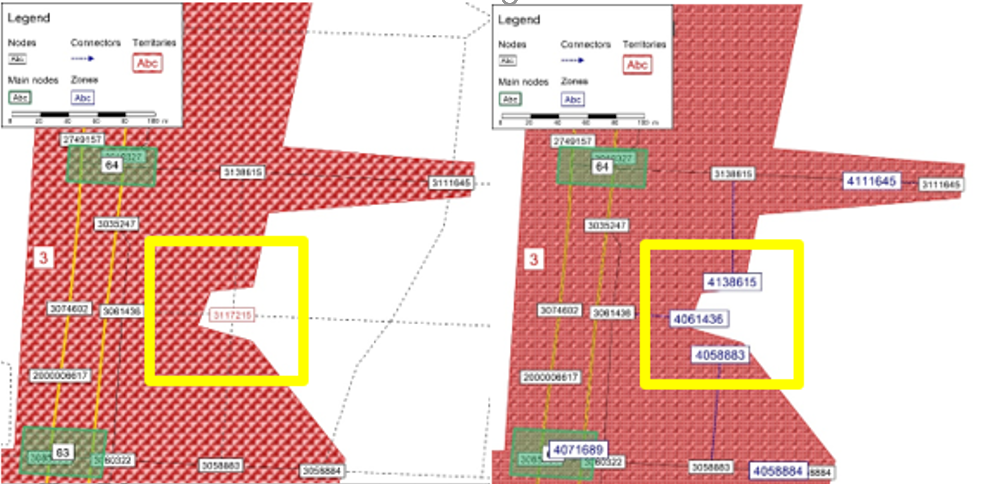 - Right: the polygon node is adjusted so that it includes the connector links at the northern end. As a result, the yellow highlighted edge has a unique sequence of PTV Vissim links and connector links again.