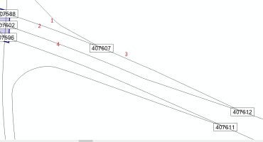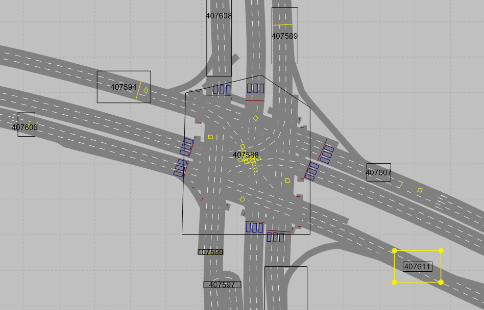 For the node 407607 these are the links (marked with 1-3), which should be contained by the polygon area in PTV Vissim. No other links (marked as 4) should be contained in the polygon.