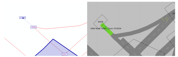 As presented in the figure (Visum on the left, Vissim on the right) a short artificial link (dummy link) should be added in Vissim (the green one). A parking lot for a specific zone 1016504 should be placed on this link. At the end of the link a proper node (the one to which a connector is attached in Visum) should be placed (node 16504).