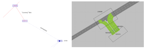 Traffic is entering and leaving the primary network via demand connectors. Due to the requirements of Optima Micro and the architecture of the Macro model, a connector should be attached to an additional “dummy” link in the Macro model (a very short link preventing connecting zone directly into primary network to a node with more than one link).