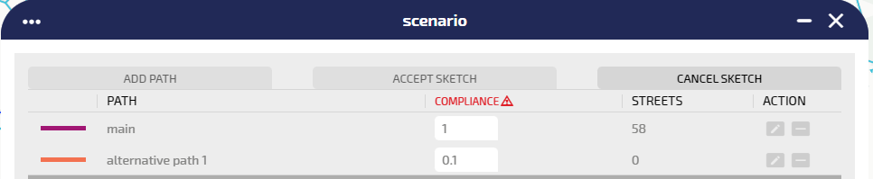 Tip: The compliance of a path represents the probability of the flow rerouting on that path. The compliance values are automatically adjusted as a fair split 1 / N, where N is the number of defined paths. You can change the values, considering that the sum of these N values MUST BE 1.