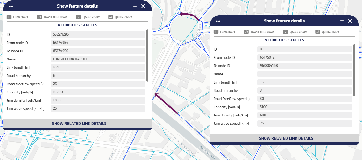 In the image on the left, as for the street detail related to street ID=55228044, it is not belonging to a main path: therefore the button SHOW RELATED LINK DETAILS is not selectable.