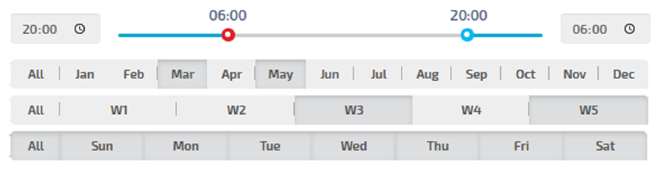 If you want to add a complex validity extending past midnight, you can drag the red dot of the slider before the blue dot. In the example, you can see a time interval starting from 20:00 of the current day to 06:00 of the next day: