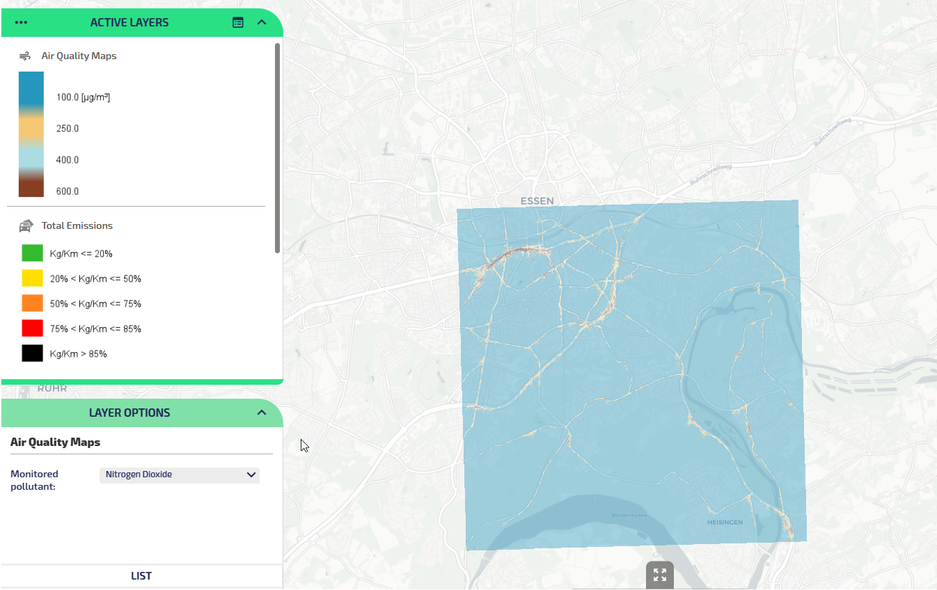 The air quality layer displays a "heat-map" associated to the distribution and concentration of pollutants.