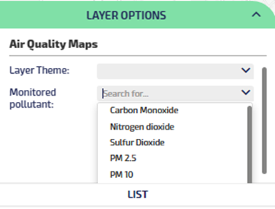 Any pollutant of the aforementioned list is associated to a display name that you can select in the Monitored pollutant combo-box (LAYER OPTIONS area):