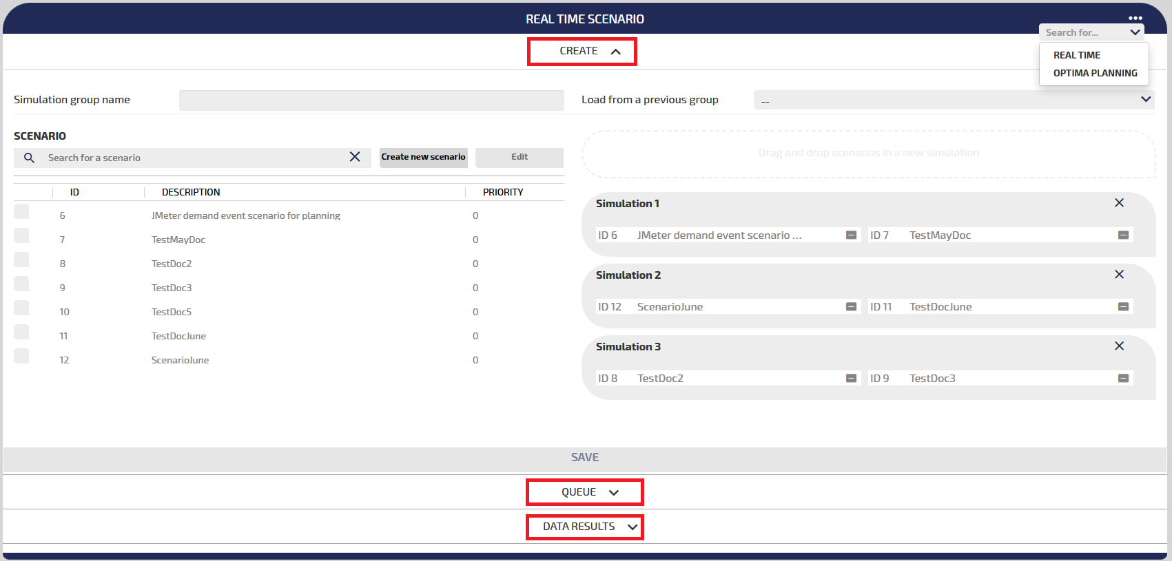 The area hosts the simulation groups that you can build by simply selecting a scenario (left click) and dragging it into the Drag and drop scenarios in a new simulation white dashed area.