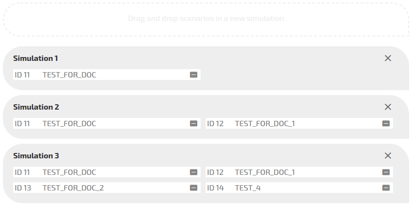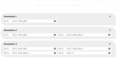 Each simulation is represented by a gray box listed vertically. If you want to add a scenario to an existing simulation, the scenario can be dragged into the related simulation box.