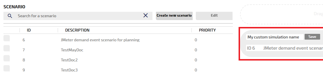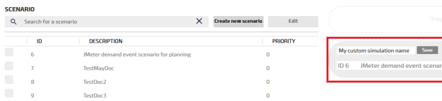 In the SCENARIO Area, select a specific scenario (left click) from the list and drag it into the Drag and drop scenarios in a new simulation white dashed area.
