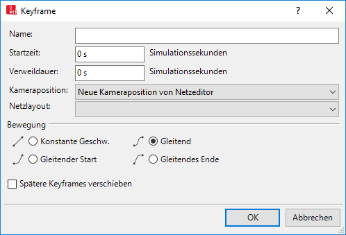 Die letzten beiden Optionen können verwendet werden, um einen Keyframe ohne Verweildauer als „Zwischenpunkt“ einer Bewegung von Keyframes zu definieren, beispielsweise; um Einfluss auf die Wegstrecke zu nehmen. |