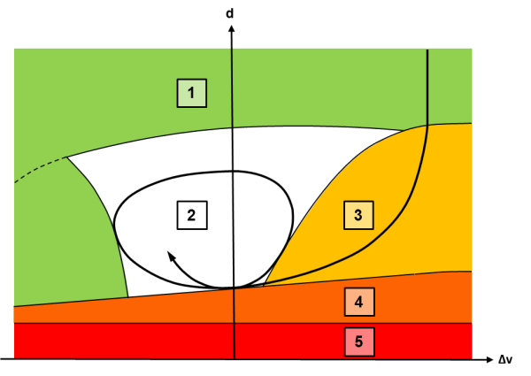 | Achsen: d: Abstand, Δv: Änderung der Geschwindigkeit | 3: Annäherungsbereich |