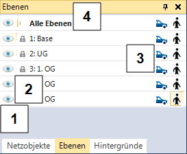 - Symbol ist farbig und geöffnet: Statische Objekte auf dieser Ebene werden im Netzeditor angezeigt. In der Netzobjektleiste muss zudem die Sichtbarkeit der Netzobjekttypen aktiv sein.