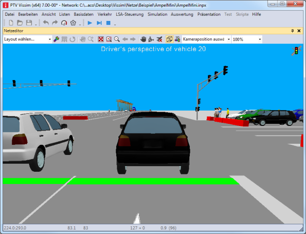 Bei einer Kameraposition aus der Fahrerperspektive ist realitätsnah das jeweilige Fahrzeug selbst nicht sichtbar. Wenn Sie eine Kameraposition nicht in einer Fahrerperspektive festlegen, sondern frei so positionieren, dass die Kameraposition an oder in einem Fahrzeug liegt, werden Teile des Fahrzeugs angezeigt. Dies gilt für Fußgänger entsprechend.