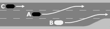 Fahrzeug A verhält sich bei diesem Fahrstreifenwechsel so, als ob es aufgrund einer Verbindungsstrecke in großer Entfernung den Fahrstreifen wechseln müsste. Es akzeptiert dabei die eigene maximale Verzögerung und die des Folgefahrzeugs C auf dem neuen Fahrstreifen entsprechend der Parameter für notwendige Fahrstreifenwechsel. Fahrzeug A vollzieht keinen kooperativen Fahrstreifenwechsel, wenn folgende Bedingungen erfüllt sind: