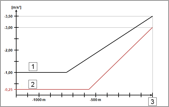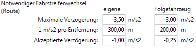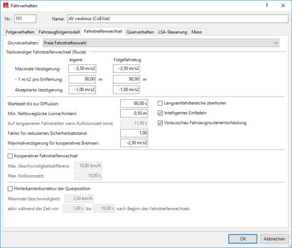 Maximale kooperative Verzögerung (KoopVerz): Gibt an, wie stark das Folgefahrzeug A kooperativ bremst, um einem vorausfahrenden Fahrzeug B den Fahrstreifenwechsel in den eigenen Fahrstreifen zu ermöglichen. Wenn das Folgefahrzeug A erkennt, dass es stärker bremsen müsste als dieser Wert angibt, falls das Vorderfahrzeug B zum Fahrstreifenwechsel ansetzen würde, wird das kooperative Bremsen abgebrochen oder nicht begonnen. Je höher der Wert, desto stärker wird gebremst und desto größer ist auch die Wahrscheinlichkeit für den Fahrstreifenwechsel. Das Vorderfahrzeug berücksichtigt bei seinem Fahrstreifenwechsel den Faktor für den reduzierten Sicherheitsabstand und die Parameter des Fahrzeugfolgemodells. Standardwert -3 m/s2.