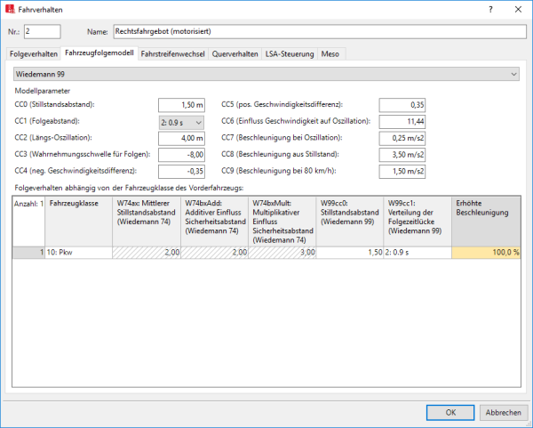 Fahrzeugfolgemodell für das Fahrzeugfolgeverhalten. In Abhängigkeit vom gewählten Fahrzeugfolgemodell ändern sich die Modellparameter.