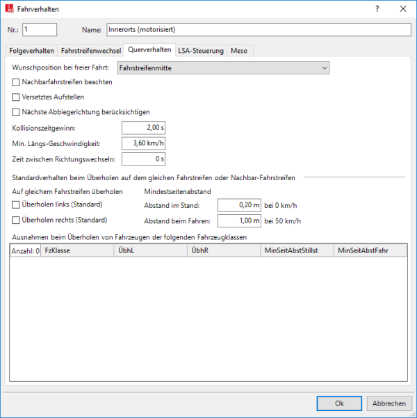 Vom Standardverhalten beim Überholen auf dem gleichen Fahrstreifen oder Nachbar-Fahrstreifen abweichendes Verhalten für bestimmte Fahrzeugklassen. Für die Modellierung von nicht fahrstreifengebundenem Verkehr können Sie Fahrzeugklassen auswählen, die innerhalb eines Fahrstreifens von Fahrzeugen dieses Fahrverhaltensparametersatzes überholt werden dürfen. 1. Klicken Sie mit der rechten Maustaste in die Liste. 2. Wählen Sie im Kontextmenü den Eintrag Hinzufügen. Eine neue Zeile mit Standarddaten wird eingefügt. 3. Nehmen Sie die gewünschten Einstellungen vor: