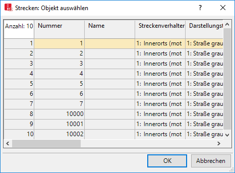 Das Fenster <Name Netzobjekttyp>: Objekt auswählen öffnet sich. Die folgende Abbildung zeigt beispielhaft das Fenster mit ausgewähltem Bezugsobjekttyp Strecken:
