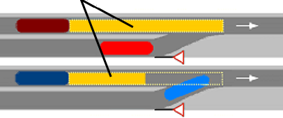 Faktor Sicherheitsabstand: nur für Typ Einmündung: Der Faktor wird mit dem normalen Wunsch-Sicherheitsabstand eines Fahrzeugs im Hauptstrom multipliziert und dient der Ermittlung des Mindestabstands, den ein Fahrzeug des wartepflichtigen Stroms einhalten muss, wenn es sich vollständig innerhalb der Konfliktfläche vom Typ Einmündung befindet. Der Faktor Sicherheitsabstand kann in der rechten Liste Zeitlücken je Fahrzeugklasse eingegeben werden. Die Abbildung unten zeigt identische Situationen mit unterschiedlichen Faktoren: oben = 1.0, unten = 0.5. Deshalb kann das blaue Fahrzeug (unten) noch einfahren, während das rote Fahrzeug (oben) anhalten muss. Der relevante Teil des Sicherheitsabstands ist in der Abbildung gelb gekennzeichnet: