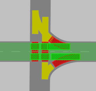 - Wenn eine Konfliktfläche in mehr als zwei Abbiegern enthalten ist und Vissim für diese unterschiedliche Status berechnet, setzt Vissim den Status auf Passiv. Für die Konfliktfläche einer Einmündung gilt zudem: Wenn sich eines der beiden Streckensegmente der Konfliktfläche auf dem Hauptstrom befindet, erhält die Strecke dieses Streckensegments Vorrang (Grün).