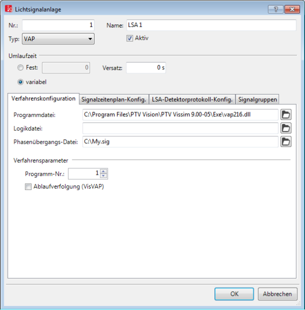| Programmdatei | ProgDat: Datei *.dll oder *.exe der Steuerungslogik, mit welcher der Knotenpunkt gesteuert werden soll. Standardmäßig vap216.dll. |