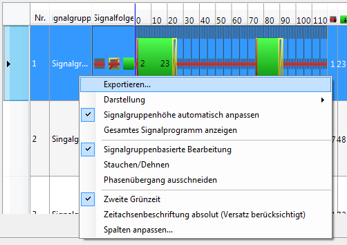 Sie können Phasenfolgen, Signalprogramme und Phasenübergänge als Grafikdateien exportieren. Die Grafik können Sie im LSA-Editor über das Menü Bearbeiten > Einstellungen im Register Export formatieren.