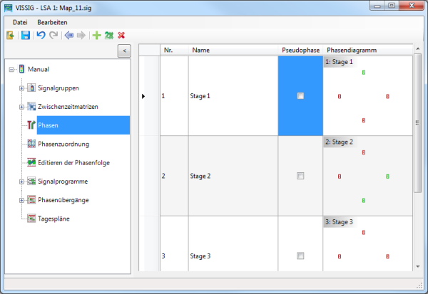 Ist die Option ausgewählt, wird die Phasendauer während einer Grünzeitoptimierung nicht verändert. Die Dauer einer Pseudophase beträgt in allen phasenbasierten Signalprogrammen null Sekunden. Diese Option dient als „Phasenübergangsteiler“ zur Abbildung des Sonderfalls, wenn während eines Phasenübergangs eine Signalgruppe mehr als einen Schaltbefehl erhalten soll. Dann wird eine solcher Phasenübergang in zwei Phasenübergänge aufgeteilt und diese mit einer Pseudophase gekoppelt.