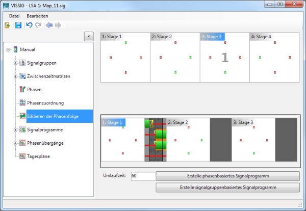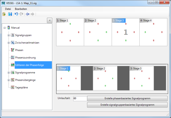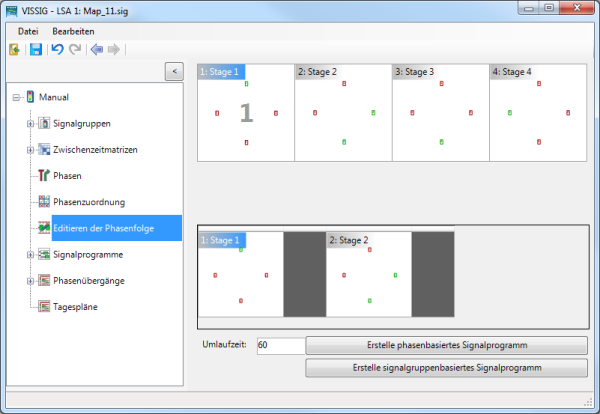 Ein phasenbasiertes Signalprogramm mit vorgegebener Umlaufdauer wird berechnet. Die Bearbeitungsansicht der Signalprogramme wird zur weiteren Bearbeitung Ihres Signalprogramms geöffnet.