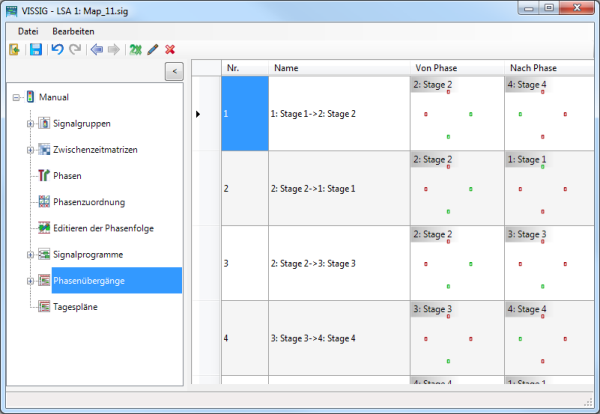 Hinweis: Wenn bei der Berechnung eines Phasenübergangs der Zustand einer Signalgruppe in der Quellphase oder der Zielphase nicht relevant ist, findet für diese Signalgruppe kein Signalwechsel statt. Innerhalb des Phasenübergangs wird der gleiche Signalisierungszustand dargestellt wie in der relevanten Phase. Wenn der Zustand einer Signalgruppe weder in der Quellphase noch in der Zielphase relevant ist, wird auch innerhalb des Phasenübergangs der Signalisierungszustand nicht relevant dargestellt. |