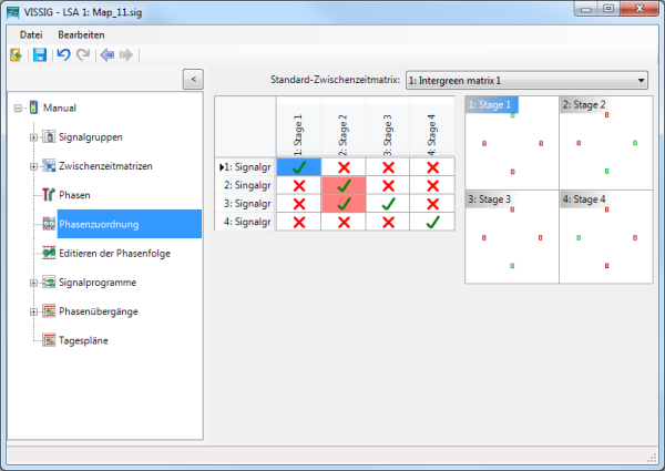 Wenn eine Zwischenzeitmatrix als Standard ausgewählt ist, werden bei der Erstellung der Phasen die Feindlichkeiten (Konfliktströme) geprüft. Bei Freigabe feindlicher Signalgruppen in der gleichen Phase, werden diese in der Tabelle rot hinterlegt.